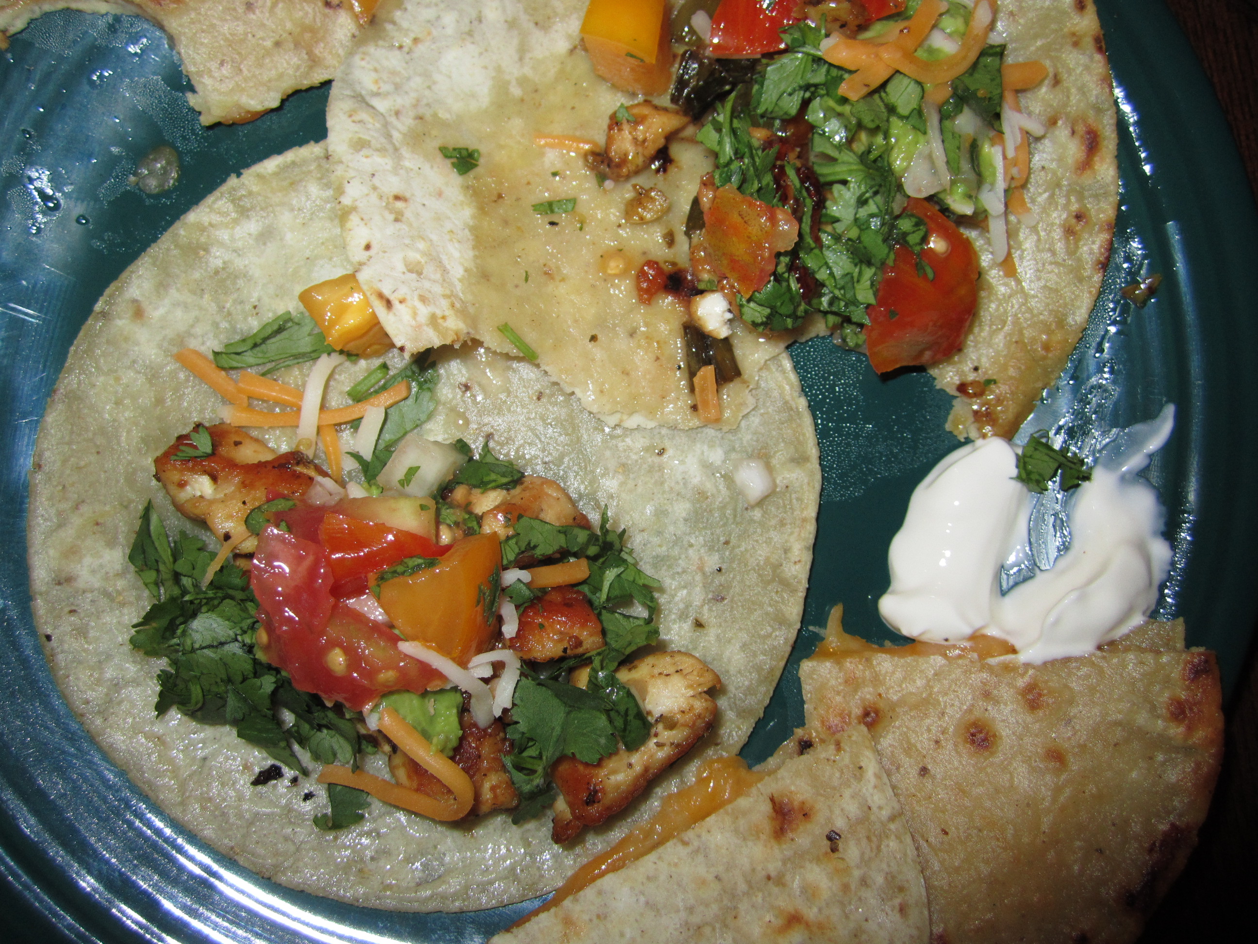 1) Quesadillas – In my cast iron skillet, I heated a tablespoon of vegetable oil and allowed one tortilla to sizzle for about one minute. I placed a hand full of cheddar and Monterey Jack cheese on its center and placed another tortilla on top. Cooked until slightly shrunken in diameter and light brown on both sides.