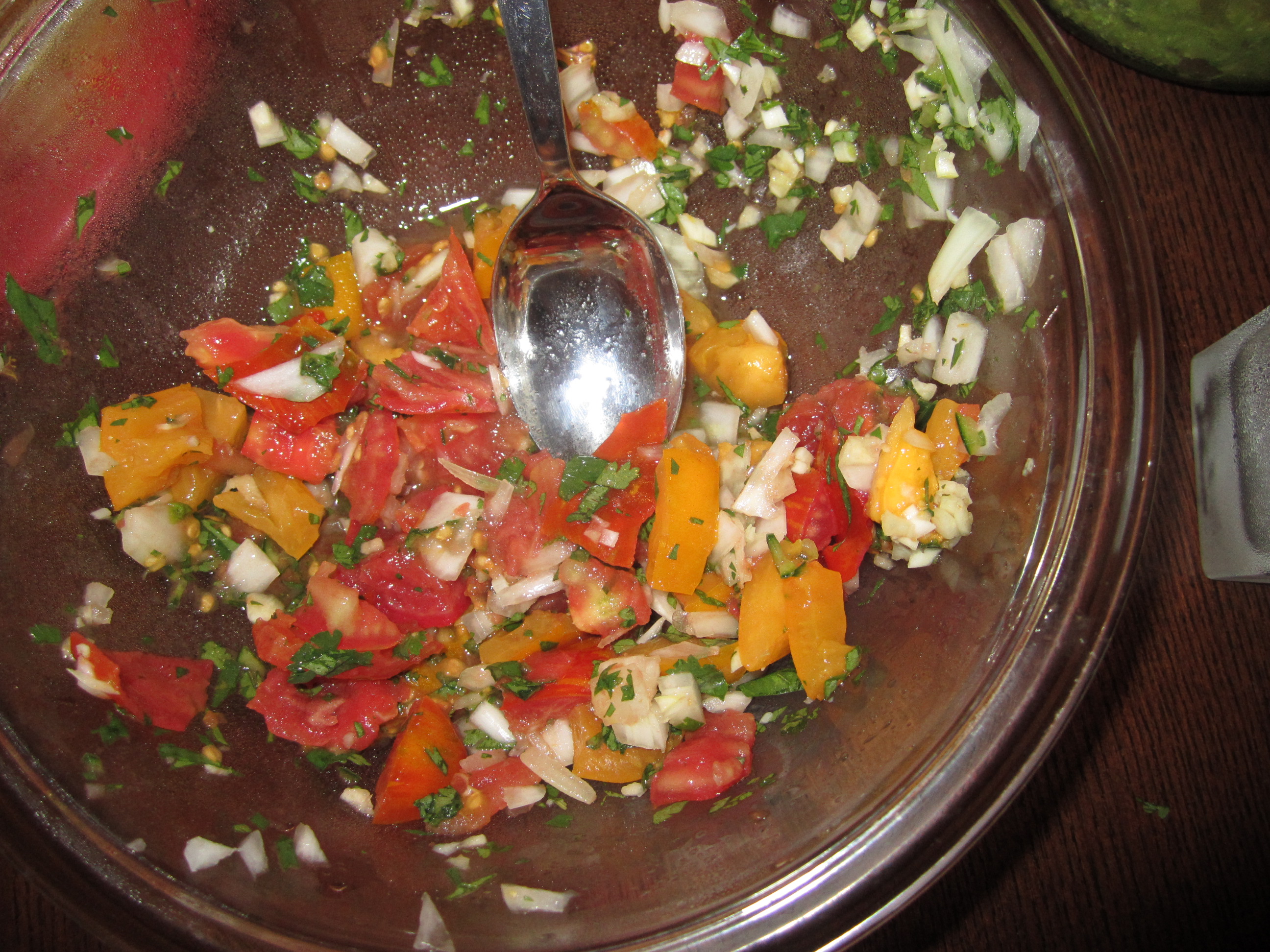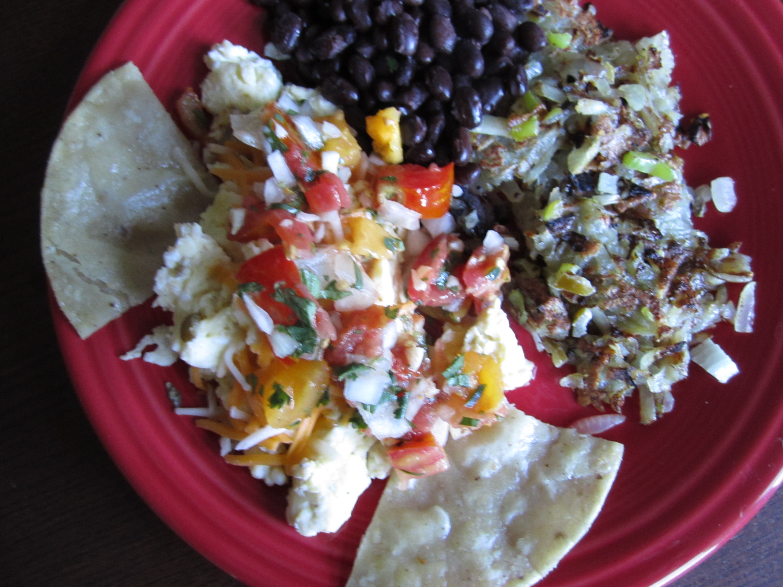 3) Huevos Rancheros (or something like that) – I only like fried or scrambled eggs, so, from the get-go, I know my huevos rancheros are anything but authentic. Black beans and hash browns sat alongside jalapeno scrambled eggs. I distributed cheese over the eggs and spooned the homemade salsa on top. Again, I heated the tortillas in the pan and cut them into quarters, making softer, flimsier versions of Tostitos. Sour cream on the side. Done and delicious.