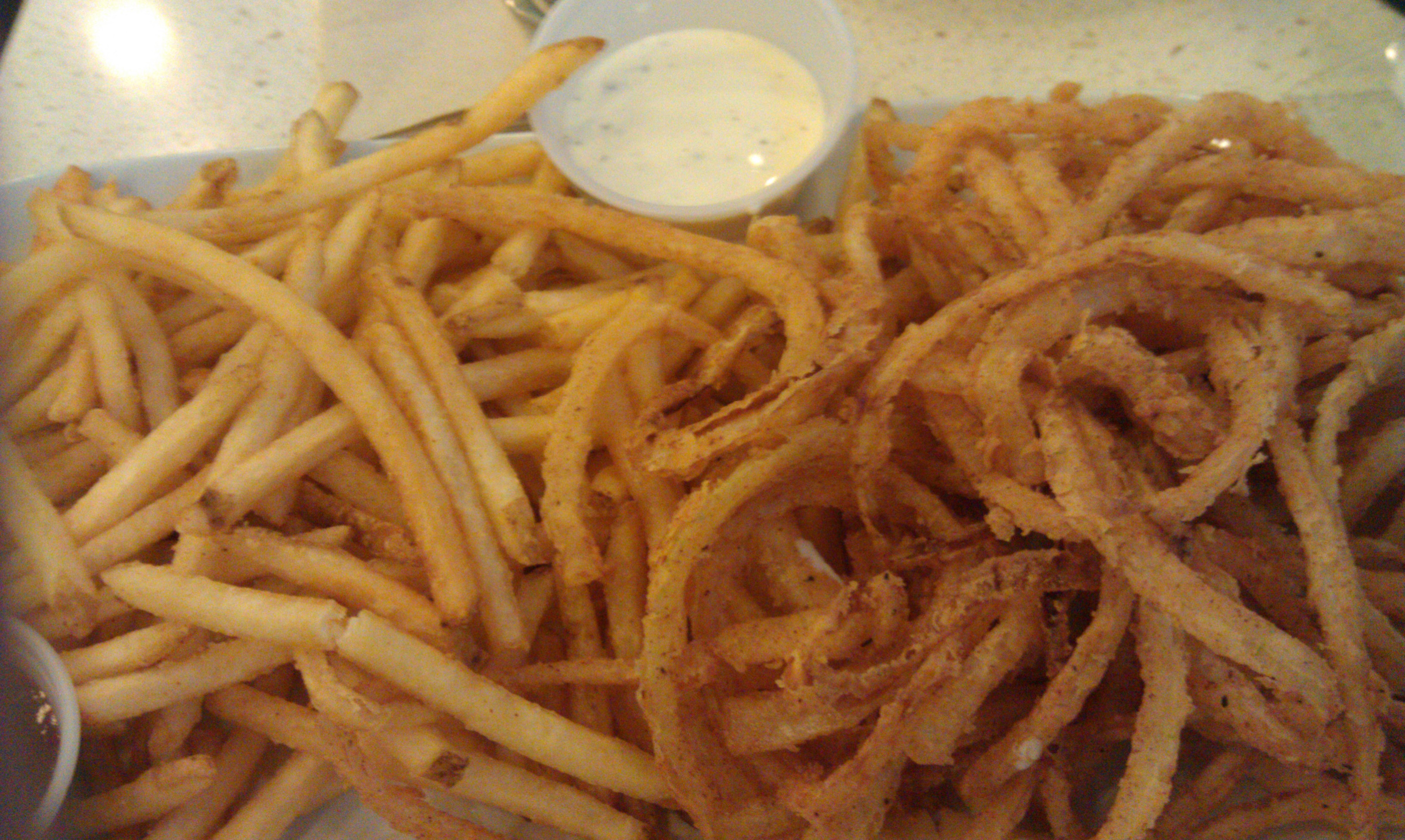 Served with ranch dressing (“America’s favorite dressing”) and barbecue sauce (it had a kick to it), they were acceptable on a whole. Individually, the match stick fries won our taste test. The onion strings were light and delicate, which was nice, but they didn’t pack the desired cringe-worthy onion flavor with each bite.