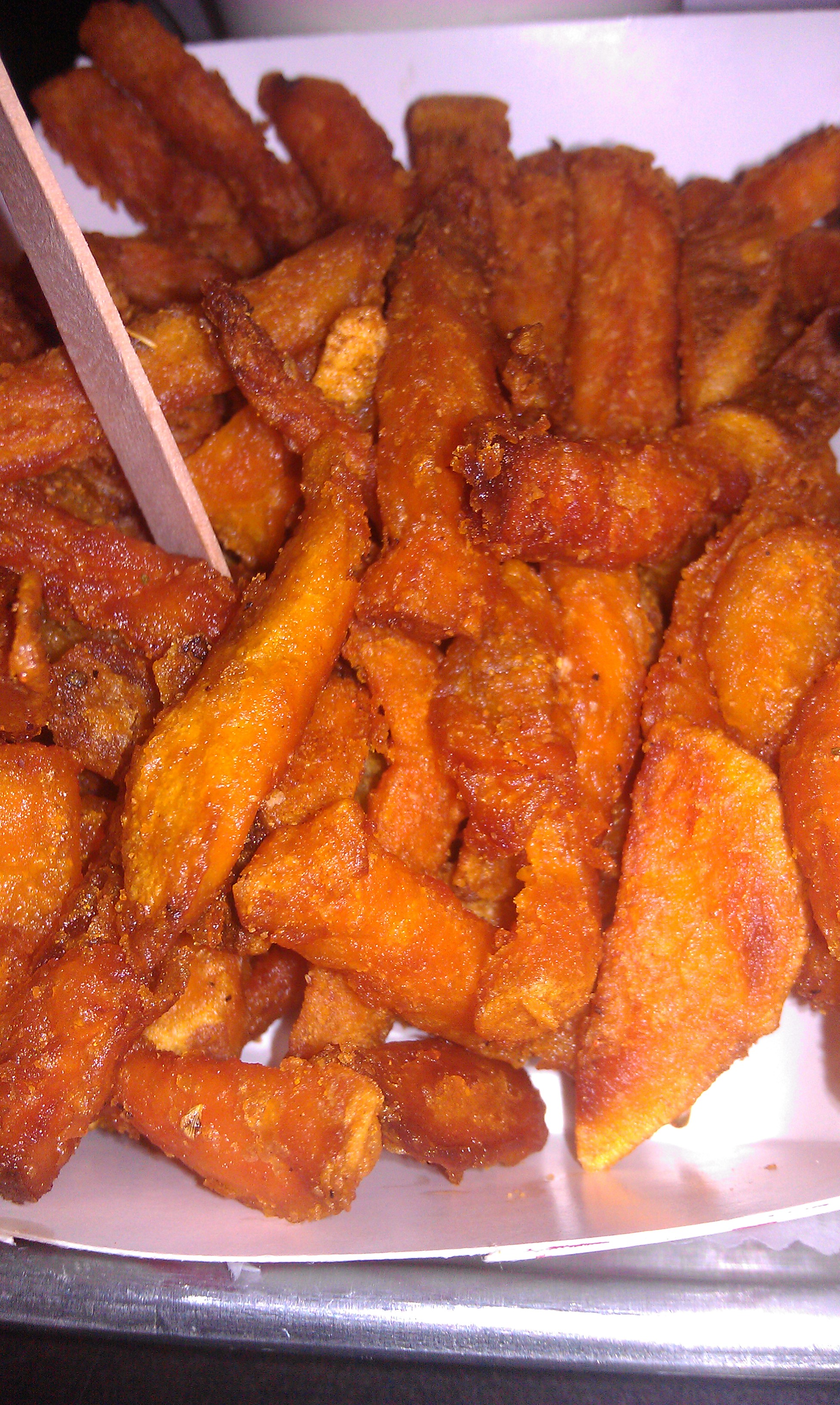 I ordered a Milk Burger, cooked medium (though it was more rare than I would have liked). She ordered a portobello mushroom “burger” with Muenster and cheddar cheeses, just like the Shake Shack. I thought, what the hell, I’ll get a shake while I’m here, so I opted for the black-and-white. We also got sweet potato fries, drizzled with truffle oil.