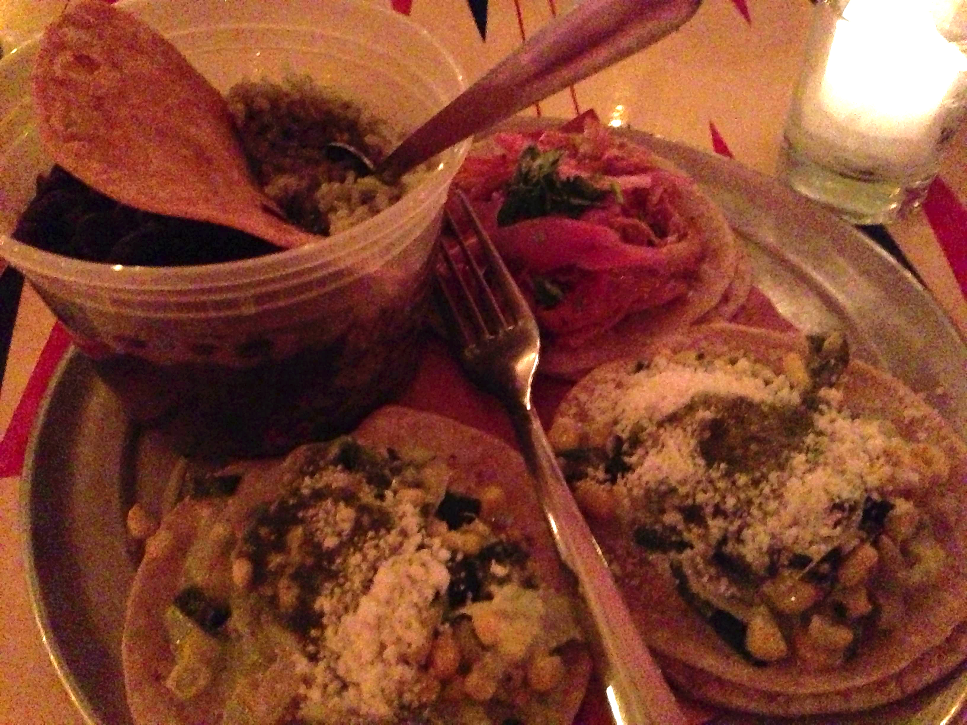 For entrees, you order tacos, because this is what you’re meant to order at Tacombi (they have quesadillas, too). You’ve heard that the maiz y poblano (cheese) taco is extraordinary, so you get two of those and enjoy them greatly. You also order a pollo taco because you fear spicy food and want something basic. The pollo taco doesn’t impress you, and you return to the second maiz y poblano taco. You order rice and beans on the side, because they’re delicious, and you delight in the soupy black beans mixed with short grain rice.