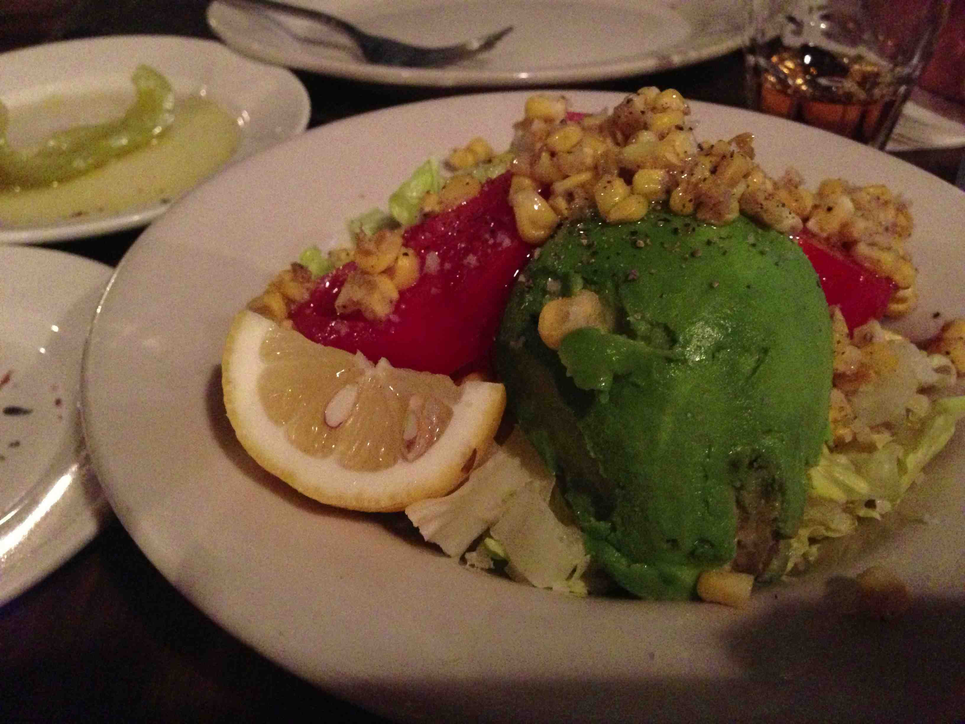 If you look online at Sauce’s website, their menu is basically illegible. It’s impossible to know what description goes with what dish and so on. At the restaurant itself, the menu is much more clear. We were presented a thick list of specials–which seems odd to me. Why not put more on the regular menu instead of having so many specials each night? I digress–and selected the avocado salad off that menu for our appetizer. Initially, I had thought that we would get their garlic bread, sold by the piece (another oddity), but they fed us delicate slices of bread and vegetables soaked in olive oil when we sat down.