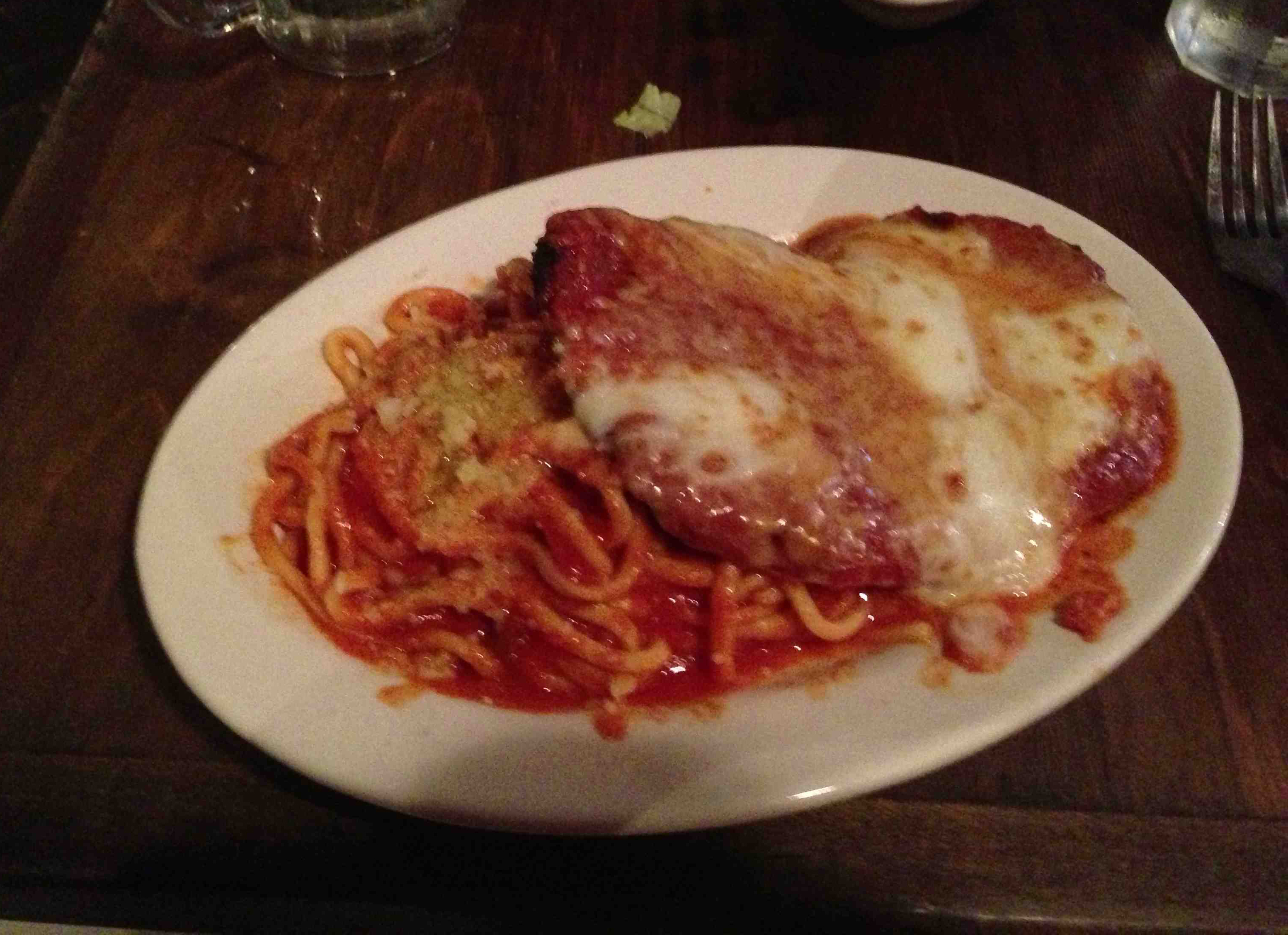 My chicken parmigiana was fine. The chicken itself was tender and easy to cut through, but they put way too much of their eponymous sauce on the chicken and not enough mozzarella. The ratio was off. In addition, they offered me a side of homemade spaghetti, which was voluminous and dense, with ample amounts of their sauce on top–but no spoon to eat it with. Also, there wasn’t any parmesan cheese on the table for my dish. They just put some on top of the spaghetti at their own discretion. These hints clued me into the fact that Sauce is not entirely authentic.