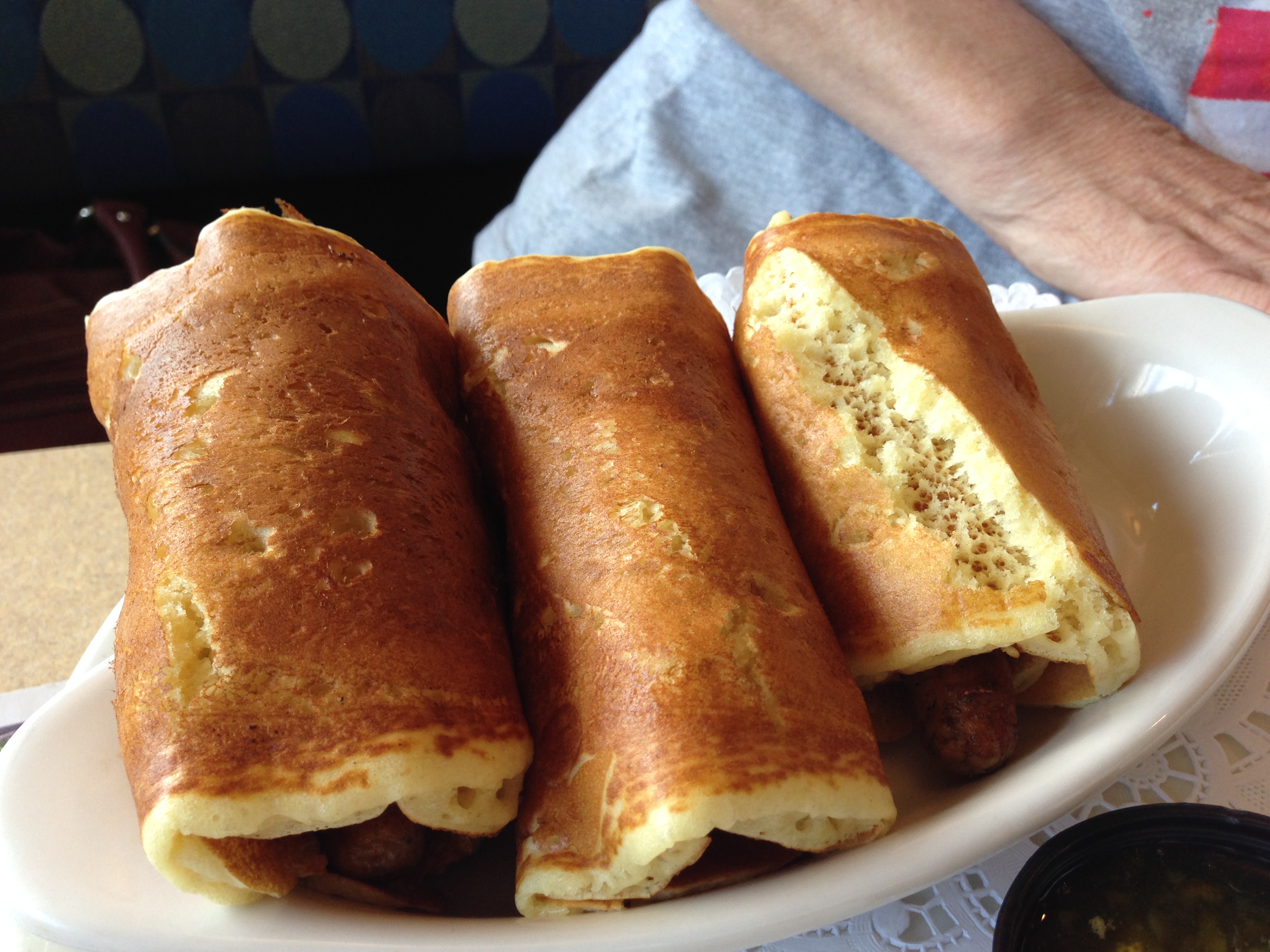 For the second morning in a row, we woke early and got on the road to try Mom’s Kitchen, which was located out by the crappiest mall I’ve ever been to. (It was so bad, the nicest store in it was Target.) Mom’s Kitchen is in a strip mall, so I didn’t expect much. And really I didn’t get much in return from Mom’s. I ordered a special that came with biscuits and gravy, eggs, home fries, sausage patties and, for some reason, toast. Not sure why they give patrons toast when they already have biscuits as part of the dish, but I didn’t question it. I even specified rye toast and had it buttered–I’m glad I did since I ended up filling my gut on the toast. The first problem with my dish was the tepid white gravy. It lacked flavor. Next, the biscuits weren’t very good or fresh tasting. Third, the eggs were browned and nearly burnt. Not a fan of Mom’s, I have to say. My mom ordered the steak and eggs, and seemed to enjoy her dish.