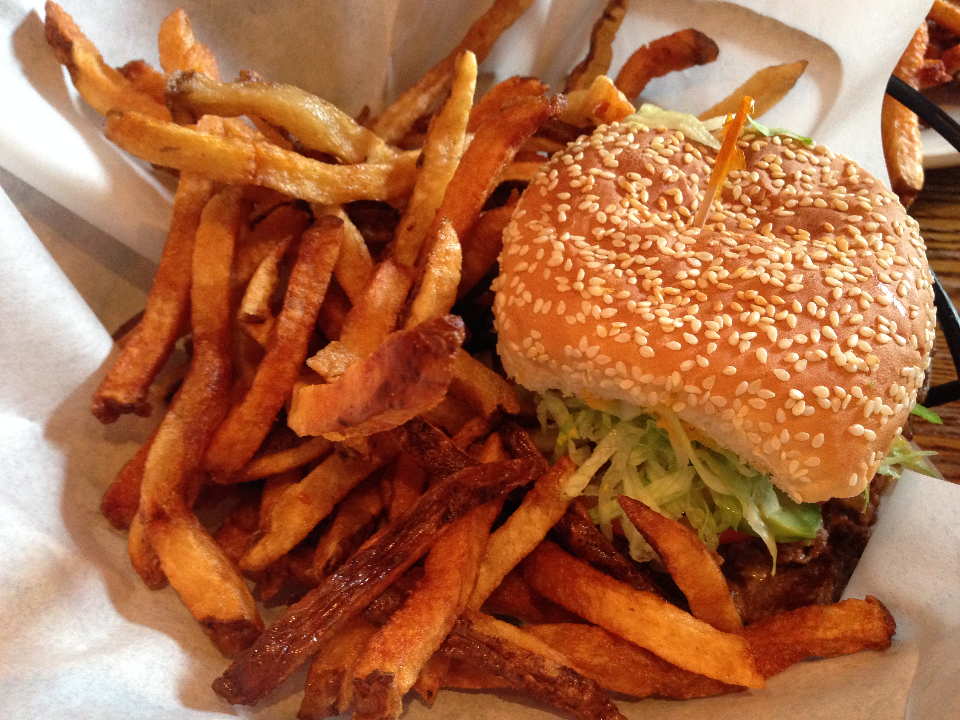 Now, if you go to Dram Shop, you must order the burger. The standard is a double patty with shredded lettuce, tomato, mayo, diced onion, mustard and cheese (you can pick which kind you want). It is phenomenal. You can also order a single patty, but Dram Shop’s burgers are so thin and slender, two patties won’t kill ya. I opted for avocado and their chipotle mayo on the side, which made the burger even better. There’s something about the combination of toppings they give you that makes the burger outstanding. It also comes with fries, which are crisp and delicious.