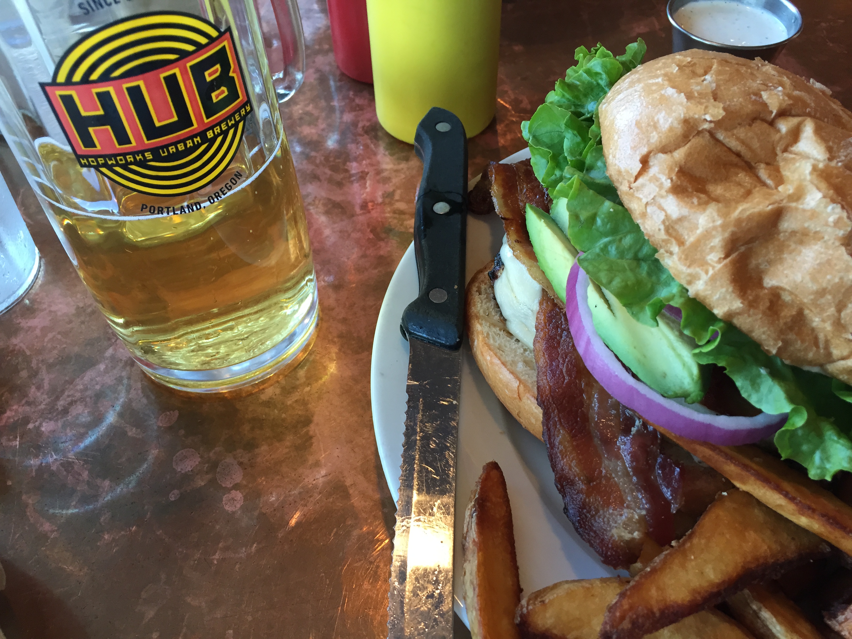 Located in the middle of nowhere (unless you’re a bowler–in that case, it’s found right across the street from your favorite bowling alley), Hopworks Urban Brewery (HUB) held so much promise and partially lived up to it. In a land filled with breweries, HUB stood out as a true destination bar with ample beers and ciders to choose from, and a decent pub menu. When we walked in, everyone’s eyes–including the servers’–were glued to the big-screen TV dangling from the ceiling showing one of the final NBA games. We sat ourselves and pored over the drink and food menus. I selected a cider from the list, and MDP got one of their house beers (although I don’t remember which one). For dinner, I ordered the chicken club, a fresh-tasting chicken sandwich with delicious avocado, exceptional bacon, and perfect green leaf lettuce all squeezed between a soft pub bun. It was fantastic. MDP chose one of the salads and seemed pleased with it. The reason why HUB only gets four stars was simply because their carrot cake tasted terrible. A new addition to the menu, the carrot cake was topped with ginger-inflected frosting–the competing spice and ginger flavors were too much for me to handle. I also wasn’t crazy about the service there…