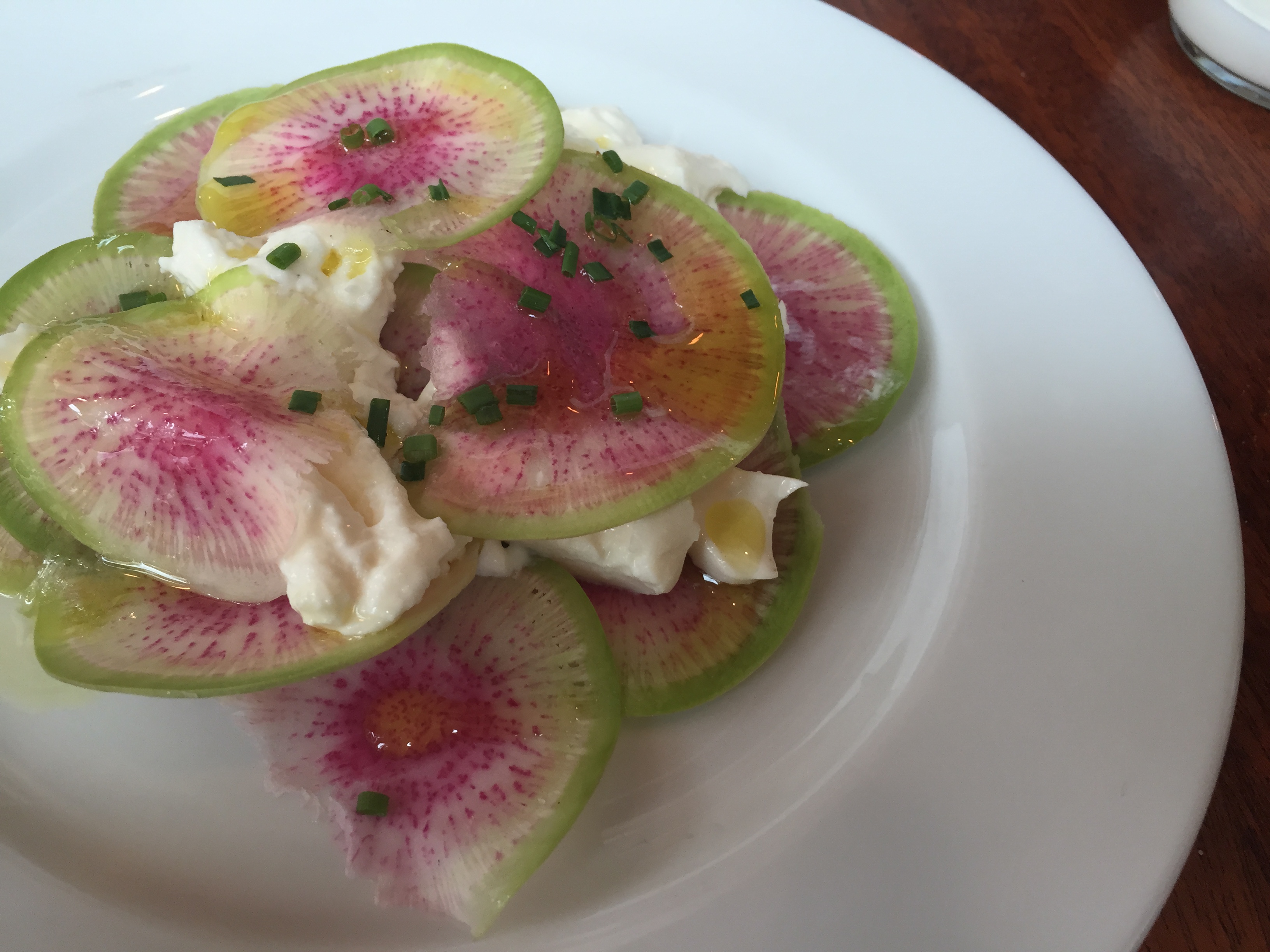It’s hard for me to assess whether Tasty n Alder or Irving Street Kitchen (later in this post) has better food. They’re both outstanding restaurants. Tasty n Alder has a New York feel: it has the modern clean aesthetic and serves up small plates. We began our culinary journey with the chocolate potato doughnut with creme anglaise–very good. Next, they brought us the Korean fried chicken, which came with short-grain rice, kimchi, pickled cucumbers, a sunny-side up egg on top, and a boiled egg chopped up and sprinkled around the dish. This was fantastic–the chicken was drenched in a gochujang sauce to spice it up and I adored the pickled cucumbers (although MDP wasn’t crazy about the kimchi). Then, they brought us the fried egg and cheddar biscuit with house made bacon–fantastic!! I thought this was the best part of the meal. We also sampled the burrata with watermelon radishes, which was too pretty, too rare, and too delicious to not show you.
