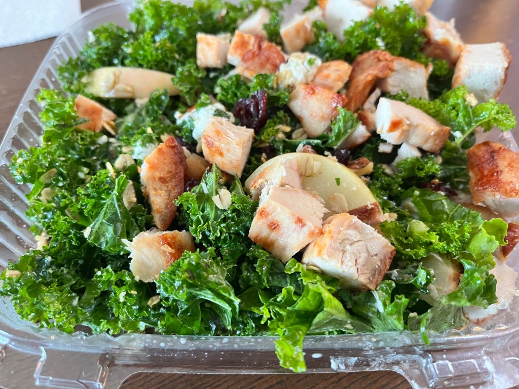 The kale apple salad is fresh-tasting and hearty. My takeout container came packed with bright-green kale, chunks of honeycrisp apples, toasted walnuts, dried cranberries, and blue cheese crumbles. I added grilled chicken ($5 extra) to round out my dish. I found the balance of ingredients to be superb and particularly liked that they tossed the salad with just-enough of the white balsamic vinaigrette dressing.