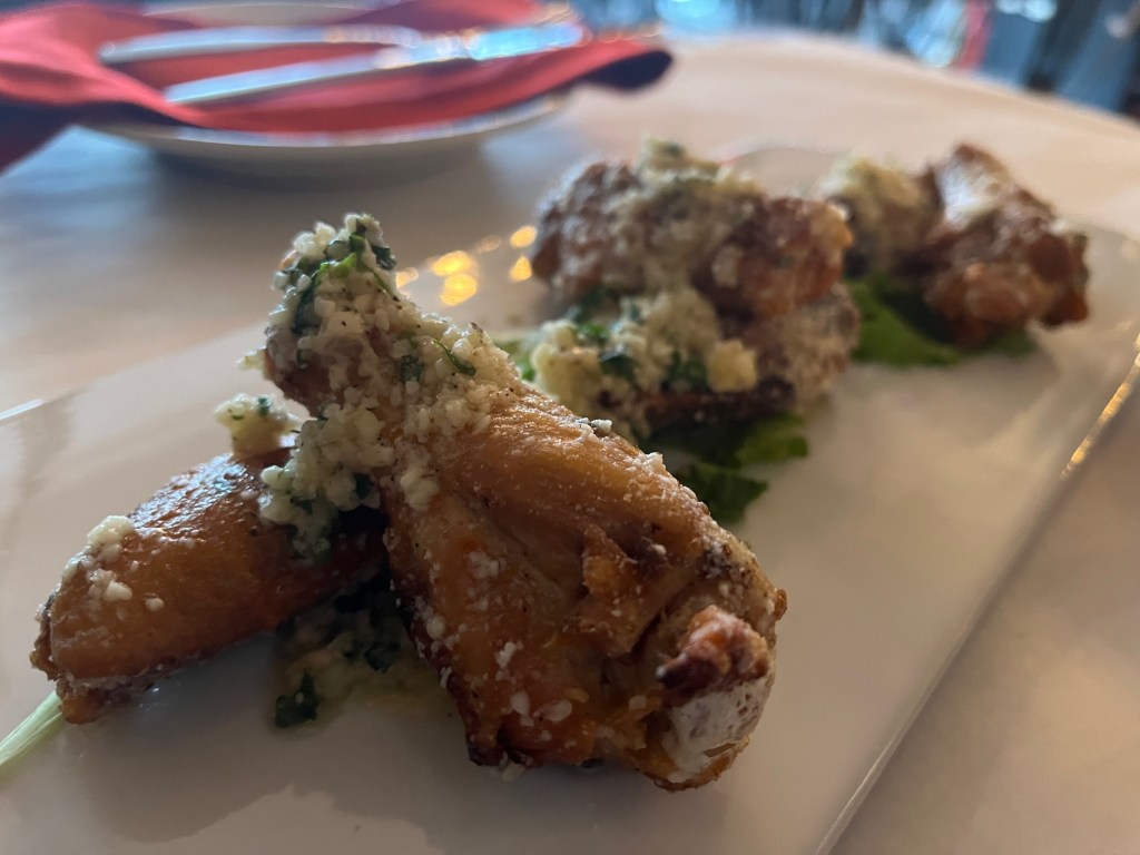 With the garlic parmesan wings – one wing dish option among several – you’ll get six to the order, and I can assure you this is only sufficient for two people. They’re baked, tender, and abundant with a garlic kick. Melted butter serves as the adhesive for the double punch of garlic and salty parmesan, a recipe designed for addiction.
